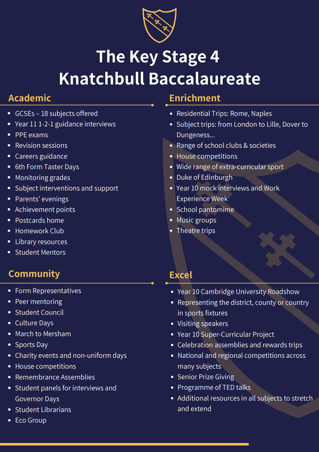 Students continue to follow a broad academic curriculum, taught by subject specialists. The options process at the end of Year 9 gives students an element of choice to build a programme that reflects their developing interests, passions and expertise. Students' experiences continue to be enriched and complemented by wider opportunities framed by the Knatch Bacc.